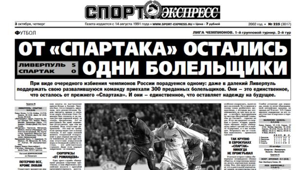 "При виде очередного избиения чемпионов России порадуемся одному: даже в далекий Ливерпуль поддержать свою развалившуюся команду приехали 300 преданных болельщиков. Они – это единственное, что осталось от прежнего "Спартака". И они – единственное, что оставляет надежду на будущее".