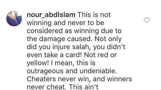 Nour_abdIslam: "Это не победа и не может таковой считаться из-за ущерба, что был нанесен. Ты не только травмировал Салаха, но и не получил за это никакой карточки! Это возмутительно! Обманщики не побеждают, а победители не обманывают. Это вообще нельзя назвать игрой. Твоя команда – просто провал. Ты не заслуживаешь этой медали и кубка. Иди тренируйся в рестлинге".