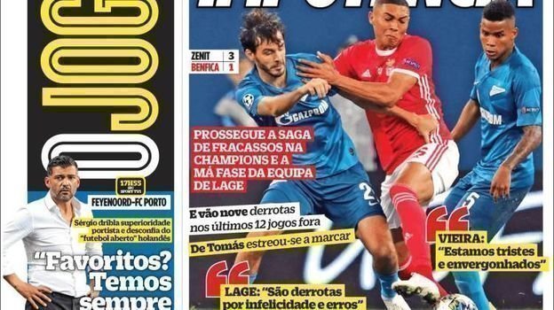 Издание вышло с заголовком «На дне» на обложке и напомнило, что «Бенфика» проиграла 11 из 14 последних матчей в Лиге чемпионов.