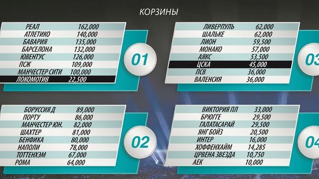 Корзина 1: "Реал" (Испания), "Атлетико" (Испания), "Бавария" (Германия), "Барселона" (Испания), "Ювентус" (Италия), "ПСЖ" (Франция), "Манчестер Сити" (Англия), "ЛОКОМОТИВ".