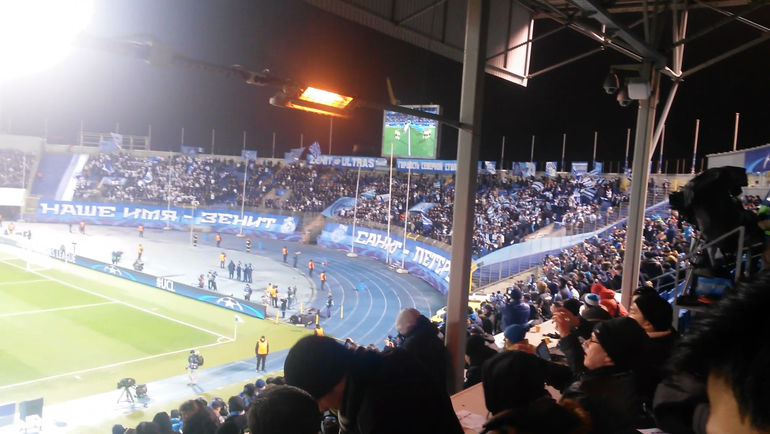 Фанаты "Зенита" вместе с лидером группировки "Ленинград" Сергеем Шнуровым дружно поддерживают команду в ответном матче 1/8 финала Лиги чемпионов с "Бенфикой".