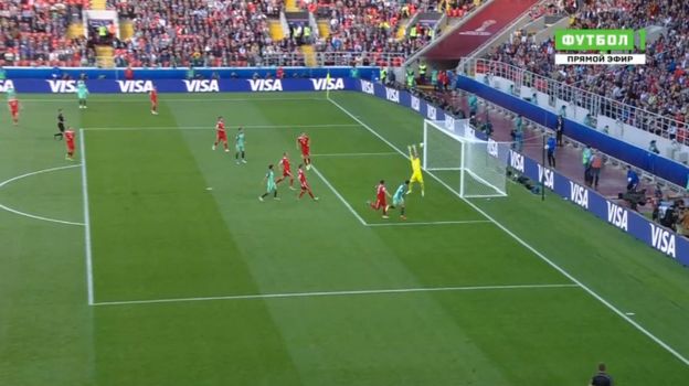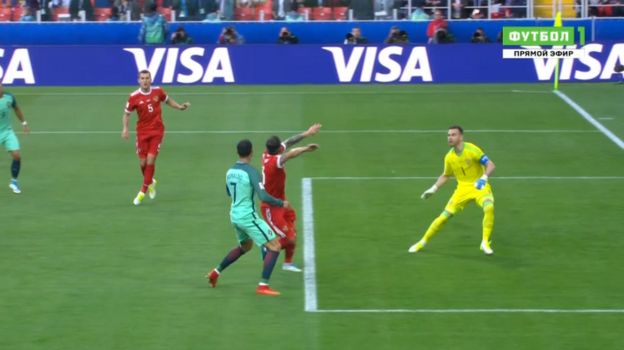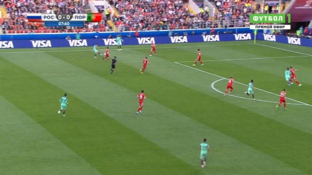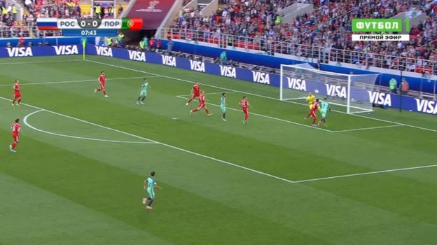 Там, в свою очередь, остался без присмотра Криштиану Роналду, которого наши футболисты, похоже, не ждали на правом краю португальской атаки – ответственный за эту зону Комбаров оказался далеко от португальца, а Кудряшов не успел сместиться и занять позицию вплотную к Роналду.