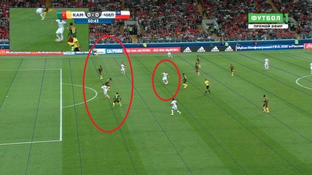 На 45+1-й минуте матча Кубка конфедераций Камерун - Чили, когда нападающий чилийцев Варгас забил гол, впервые в этой игре и в третий раз на турнире пришлось просматривать видеозапись. Арбитр Дамир Скомина поначалу взятие ворот засчитал, но уже вскоре это решение отменил.