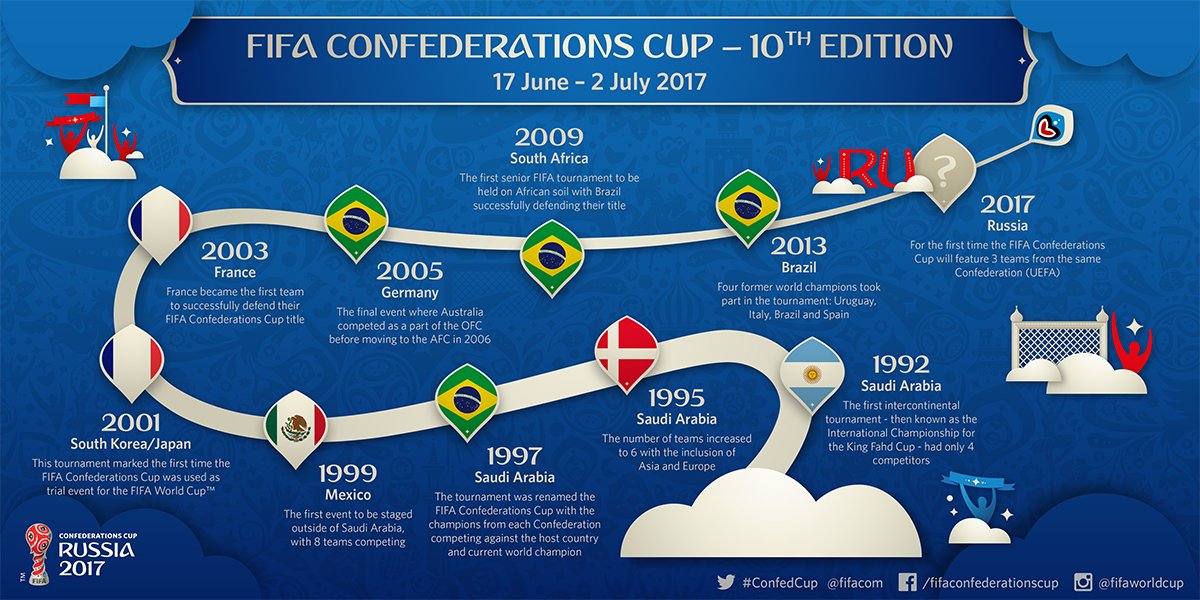 Небольшая инфографика, нарисованная пресс-службой ФИФА. Это может показаться увидительным, но первые два турнира были коммерческими, а первый официальный Кубок конфедераций состоялся в 1997 году.
