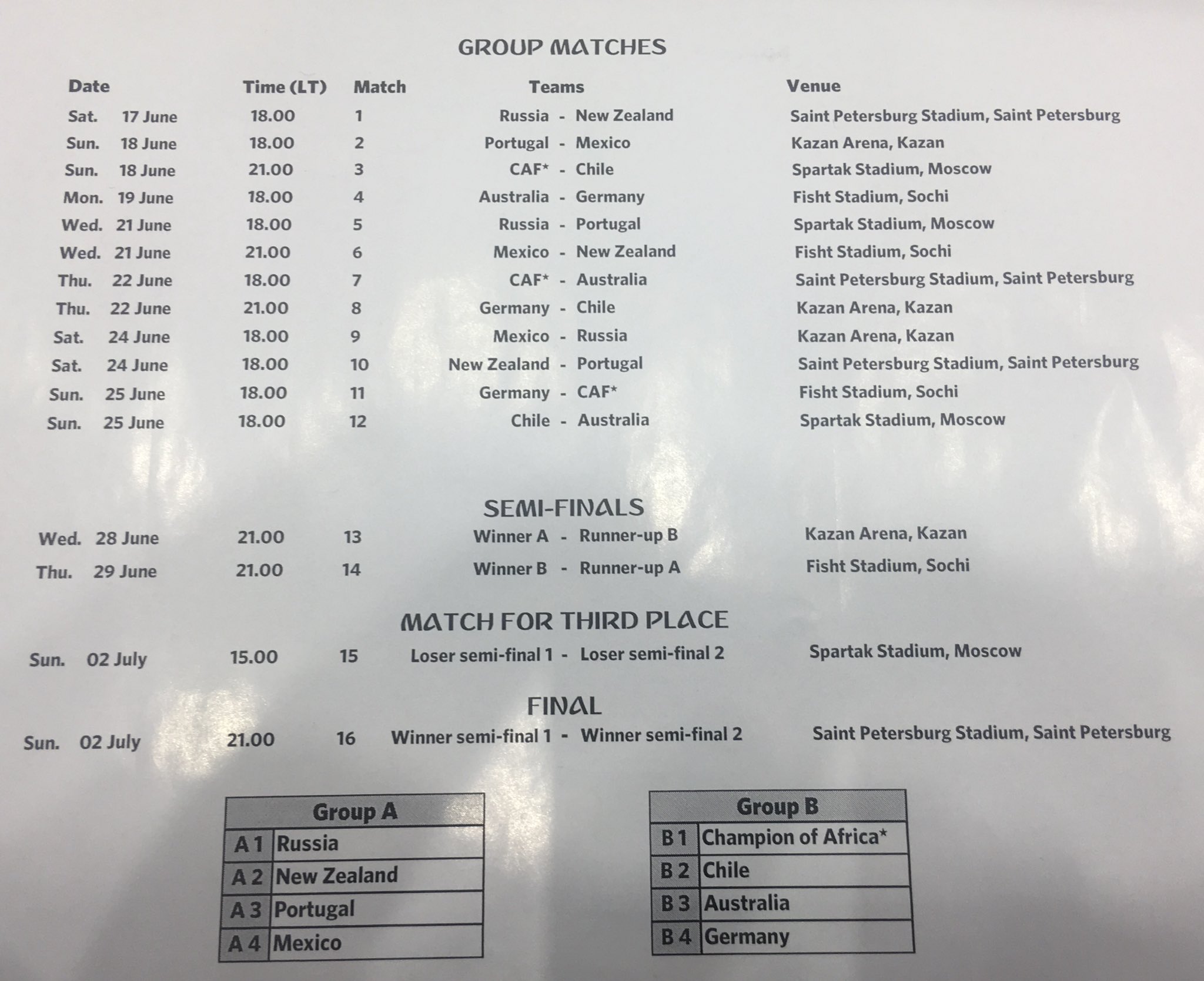 Кубок конфедераций пройдет с 17 июня по 2 июля 2017 года. Главным городом турнира станет Санкт-Петербург. Здесь помимо трех матчей группового этапа, включая матч-открытие, пройдет финал. Другие игры примут Москва, Казань и Сочи.