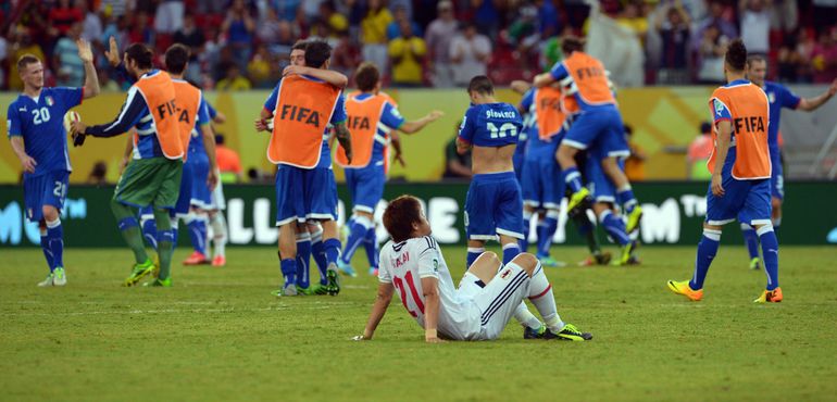 Футбол. Ресифи. Кубок конфедераций. Группа А. Италия – Япония – 4:3 (1:2). Голы: Хонда, 21 – с пенальти (0:1). Кагава, 33 (0:2). Де Росси, 41 (1:2). Утида, 50 – в свои ворота (2:2). Балотелли, 52 – с пенальти (3:2). Окадзаки, 69 (3:3). Джовинко, 86 (4:3). Фото AFP