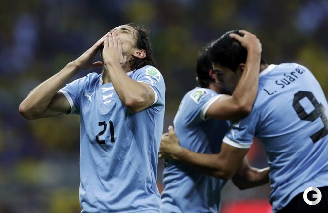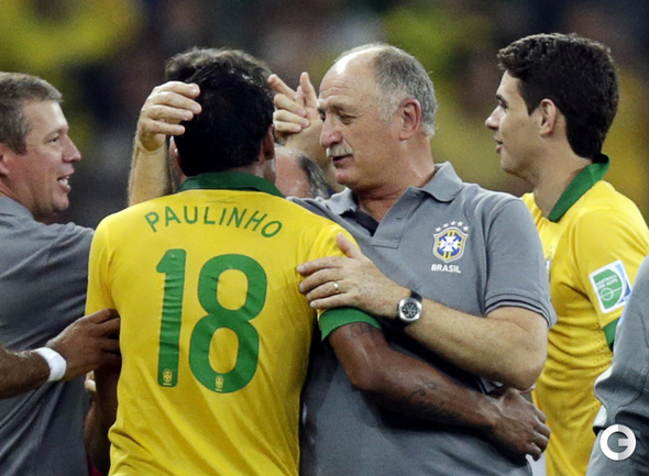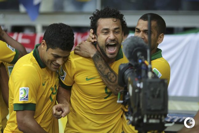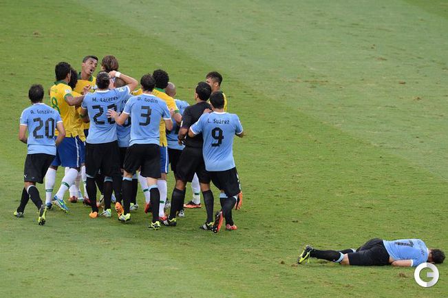 Сборная Бразилии одержала четвертую победу на Кубке конфедераций и вышла в финал турнира. Белу-Оризонти. Кубок конфедераций. 1/2 финала. Бразилия - Уругвай - 2:1 (1:0). Голы: Фред, 41 (1:0). Кавани, 48 (1:1). Паулинью, 86 (2:1). Нереализованный пенальти: Форлан, 14 (вратарь). Фото AFP, REUTERS