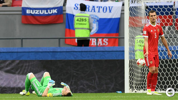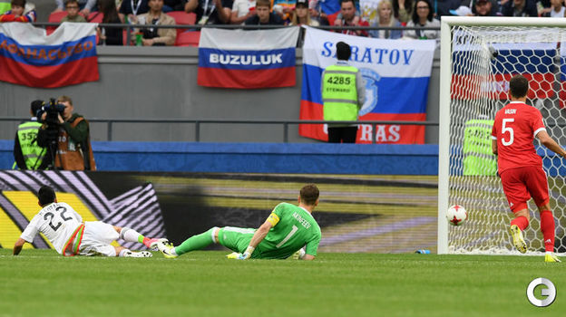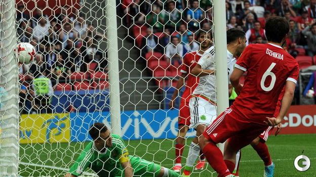 Сборная России в матче Кубка конфедераций-2017 в Казани уступила Мексике - 1:2. В кадрах "СЭ" - голы латиноамериканцев, которые оперативно отыгрались в первом тайме (на 25-й минуте Александр Самедов открыл счет, но уже через 5 минут отличился Нестор Араухо) и провели победный выпад в начале второй половины (на 52-й минуте после ошибки Игоря Акинфеева победный гол забил Ирвинг Лосано).