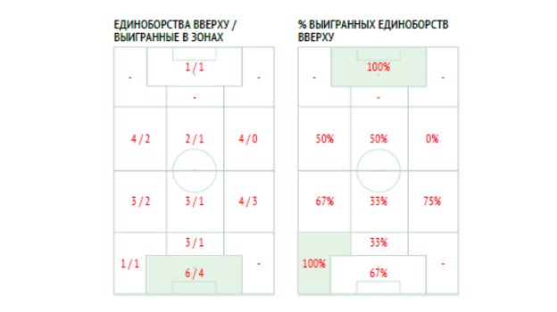 4 – Миранчук выиграл абсолютно все единоборства в атаке и лишний раз доказал, что он не субтильная утонченная натура, а настырный боец. Головин выиграл в два раза больше дуэлей, но почти половину проиграл.