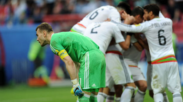 Вспомним, как забила Мексика. После безадресного, наотмашь, выноса Эрреры мяч взмыл в воздух высокой свечой, и по его траектории было видно, что опустится он неподалеку от нашей штрафной. Акинфеев, находившийся в тот момент на ее линии, сделал несколько шагов назад, но затем счел, что сможет быть на мяче первым, и двинулся обратно. Стремившийся к мячу Васин, заметив выходящего вратаря, рефлекторно притормозил, чтобы избежать столкновения и не спутать планы Игоря, оставив того один на один с Лосано. Акинфеев же, следя за летящим мячом, выскочил за пределы штрафной и заметил это слишком поздно, из-за чего, видимо, слегка растерялся. Он и тогда, имея превосходство в росте и своего рода "вратарскую неприкосновенность", мог просто сыграть головой, жестко поставив корпус, но не решился идти в стык. Может, испугался повреждения, или чтобы не заработать красную карточку за снос соперника – кто теперь поймет?… В итоге вратарь принял самое неправильное из всех решений, попытавшись снять мяч с головы Лосано ногой в стиле кунг-фу, чем лишь приумножил трагикомичность гола.