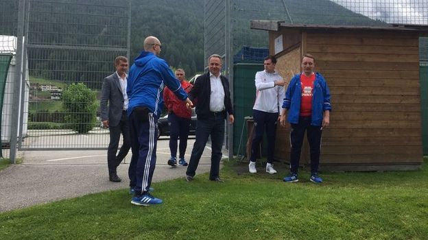 В конце тренировки на временную базу сборной России высадился внушительный десант: вице-премьер страны и президент РФС Виталий Мутко, а также генеральный директор организации Александр Алаев. Визит высокопоставленных лиц на несколько минут отвлек всех от проблем с Дзюбой. Виталий Леонтьевич первым делом разрядил обстановку и в шутку спросил журналистов, не катался ли кто-нибудь на лыжах. Не катались. У нас тут более важные дела.