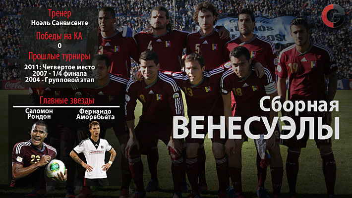 Товарищеские матчи обнажили у венесуэльцев целый ворох проблем: медленную и заметно возрастную линию обороны, безнадежно флегматичный центр поля, не способный помочь атаке. У всех этих проблем решение одно – ноги и точность Рондона. Причем добывать себе мячи форварду "Зенита" тоже, по всей видимости, придется самому – толкового подносчика в команде тоже нет. Единственным лучом света в этом темном царстве, а заодно и темной лошадкой будет Йон Мурильо. 20-летний полузащитник недавно подписал контракт с "Бенфикой", но за взрослую команду (что, клуба, что сборной) не сыграл пока ни минуты. Наряду с перуанцами сборная Венесуэлы считается одним из главных аутсайдеров турнира, за всю историю Копа Америка преодолеть групповой этап им удалось лишь дважды.