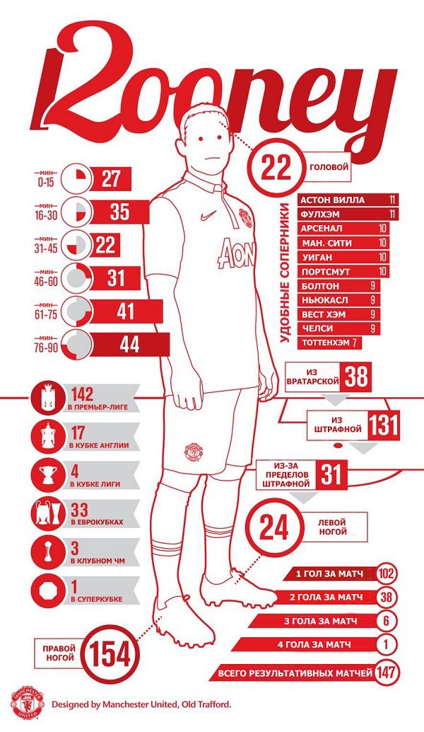 Официальный сайт "Манчестер Юнайтед" отметил 200-й гол нападающего Уэйна Руни, забитый за клуб, красивой инфографикой. "СЭ" подготовил для вас ее русскую версию. Согласно приведенной статистике, большую часть своих голов Руни забил правой ногой (154), а самым "плодотворным" временем матча для него является последняя 15-минутка: в этот период он забил 44 гола.
