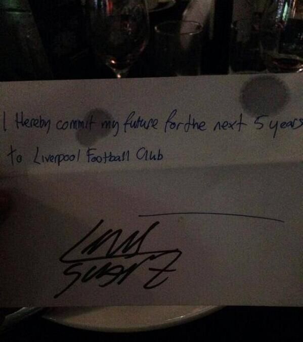 Нападающий "Ливерпуля" Луис Суарес "продлил" контракт с клубом на 5 лет, когда один из болельщиков подсунул ему шуточное "соглашение", сообщает Daily Mirror. “Настоящим я подтверждаю, что связываю свое будущее с "Ливерпулем" на ближайшие 5 лет”, – говорится в условиях "сделки".