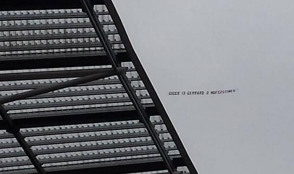 Болельщикики "Манчестер Юнайтед" запустили самолет с баннером над стадионом "Авива" в Дублине, где "Ливерпуль" проводит товарищеский матч с "Шемрок Роверс". Текст баннера гласит: "Гиггз – 13, Джеррард – 0. "МЮ" – 20 раз". Таким образом, болельщики "МЮ" поиздевались над принципиальными соперниками и их капитаном Стивеном Джеррардом, вновь упустившими титул чемпиона Англии, которых у клуба из Манчестера 20, а их играющего тренера Райана Гиггза 13.