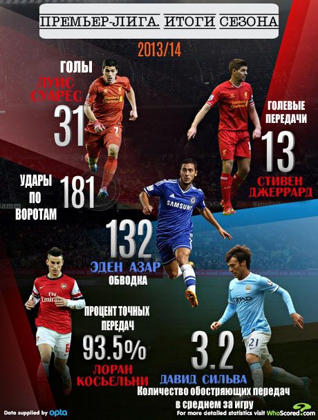 Статистический портал WhoScored.com подвел итоги чемпионата Англии-2013/14. Его победителем стал "Манчестер Сити", который на финише обошел "Ливерпуль". Еще две путевки в Лигу чемпионов получили "Челси" и "Арсенал", тогда как "Манчестер Юнайтед" остался позади "Эвертона" и "Тоттенхэма" в споре за место в Лиге Европы.