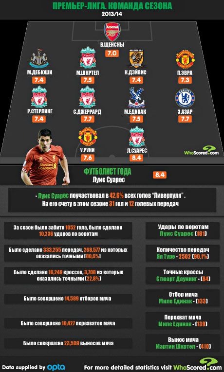 Вдобавок Суарес возглавил команду чемпионата-2013/14. Ее составили: Щенсны – Дебюши, Шкртел, Дэйвис, Эвра – Стерлинг, Джеррард, Единак, Азар – Руни, Суарес.