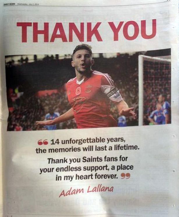 Экс-капитан "Саутгемптона" Адам Лаллана, этим летом перешедший в "Ливерпуль", выкупил полосу в газете Southern Daily Echo, чтобы попрощаться с болельщиками. Он пошел на такой шаг ради того, чтобы попрощаться с болельщиками "святых". Напомним, трансфер Лалланы обошелся "Ливерпулю" в 25 миллионов фунтов стерлингов. В сезоне-2013/14 полузащитник провел 38 матчей в чемпионате Англии, забил 9 мячей и отдал 8 результативных передач. На чемпионате мира-2014 в Бразилии Лаллана трижды выходил на поле в составе национальной команды.