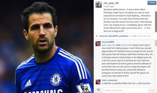 "Не понимаю, почему все ругают Фабрегаса за игру против "Саутгемптона". Этот матч провалила вся команда. Наверно, Сеск не сыграл, так как от него ожидали, но хотя бы бился. Я часто видел некрасивые выходки болельщиков "Челси", но эта была худшей. Позор нашим фанатам!", – написал Моуринью-младший в своем Instagram.