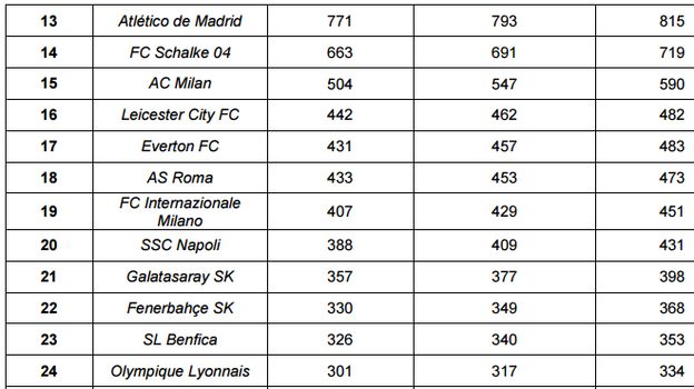 Среди 32 клубов только 6 представляют не ведущие 5 европейских лиг (Англия, Германия, Испания, Италия, Франция): это помимо "Бешикташа" "Галатасарай", "Фенербахче", "Бенфика", "Аякс" и ПСВ. Российские клубы в рейтинге не фигурируют...