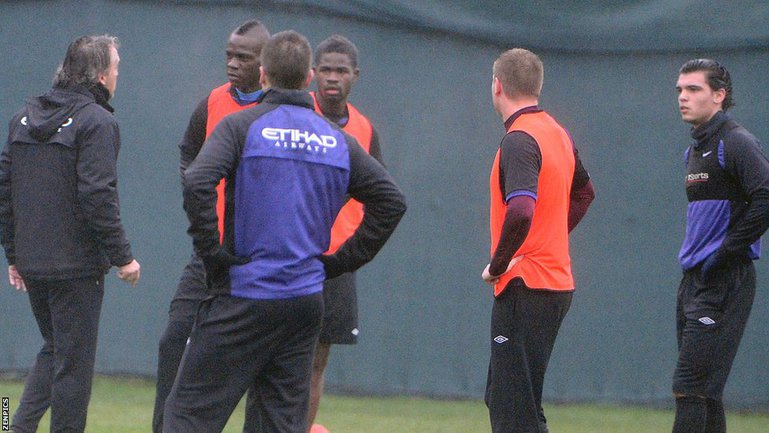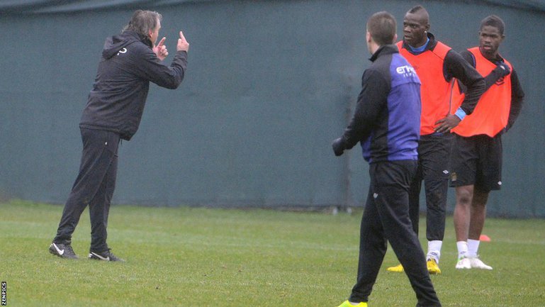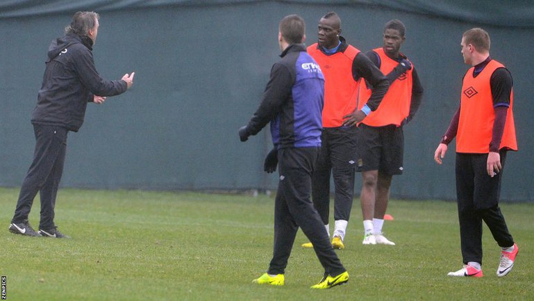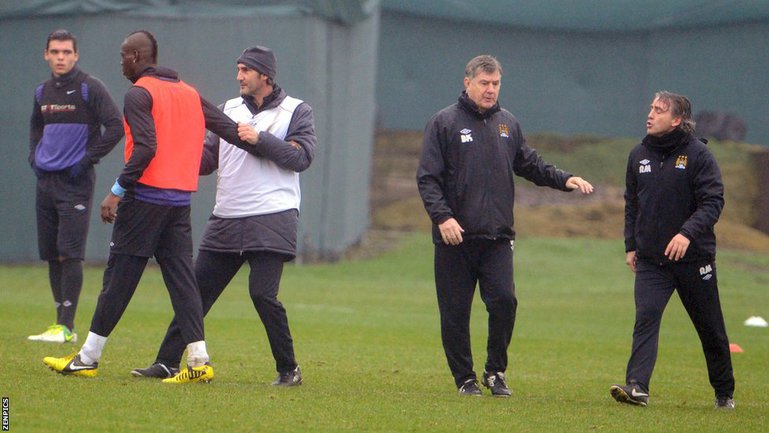 Сегодня между главным тренером "Манчестер Сити" Роберто Манчини и нападающим Марио Балотелли произошла потасовка во время тренировки "горожан" на клубной базе в рамках подготовки к субботней встрече третьего раунда Кубка Англии с "Уотфордом". Фото ZENPICS
