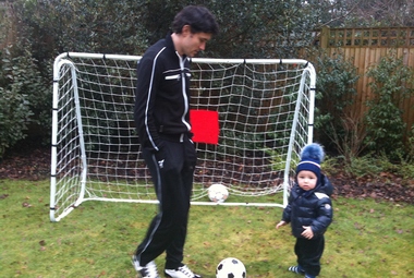 Первым делом Дмитрий Юрьевич потащил нас с папой играть в... футбол. У него сразу два мяча: один обычный, другой облегченный, детский. Оба он пинал очень уверенно. Удар у наследного футбольного принца поставлен с обеих ног, но левой он все-таки действует значительно увереннее: судя по всему, будет кому поддержать фамильную честь на соответствующей бровке.