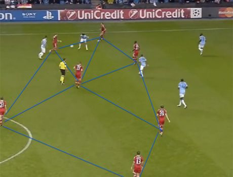 "Бавария" строит атаку против "Манчестер Сити", игроки находятся в тесном контакте и обеспечивают игроку с мячом множество возможностей отдать пас.