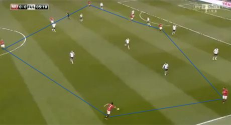 Рафаэл начинает атаку "Юнайтед" в матче с "Фулхэмом", когда ближайший игрок находится в 20 ярдах от него.