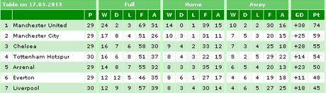 2. 26 марта 2013 года "Юнайтед" имел 74 очка после 29 матчей и лидировал в турнирной таблице с 15-очковым отрывом.