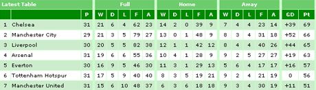 Ман. Сити | 16 | 11 | 1 | 4 | 38-16 | 34 |