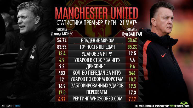 Часто приходится слышать, что к ван Галу есть огромные вопросы по игре в защите и все проблемы команды именно оттуда. Утверждение не совсем справедливо. Манчестерцы пропустили 21 гол, что на три мяча меньше, чем в чемпионате-2013/14, и позволили соперникам нанести меньше ударов по своим воротам – 10,7 против 12. Так что с теорией о том, что Мойес строил команду, в первую очередь опираясь на оборону, а ван Гал предпочитает более атакующий футбол, как минимум можно поспорить.