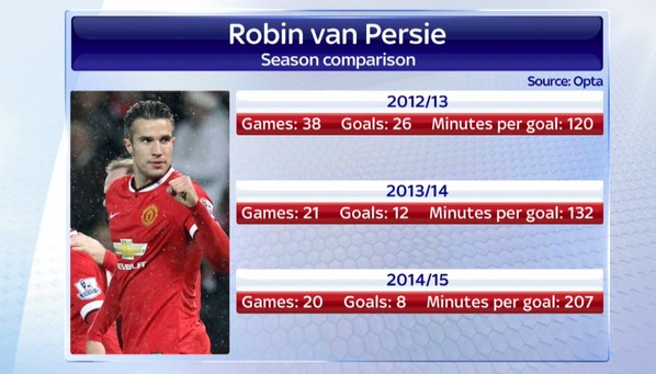 Sky Sports наглядно проиллюстрировал снижение результативности ван Перси по сравнению с прошлыми сезонами и по сравнению с результативностью других нападающих "МЮ".