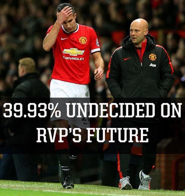 Эти неудачи повлияли на мнение болельщиков. 39,93 процента опрошенных не уверены в том, стоит ли удерживать ван Перси после окончания контракта. Еще около 26 процентов предлагают расстаться с ним немедленно, лишь треть поклонников "МЮ" по-прежнему верят в голландца и предлагают оставить его в клубе на длительный срок.