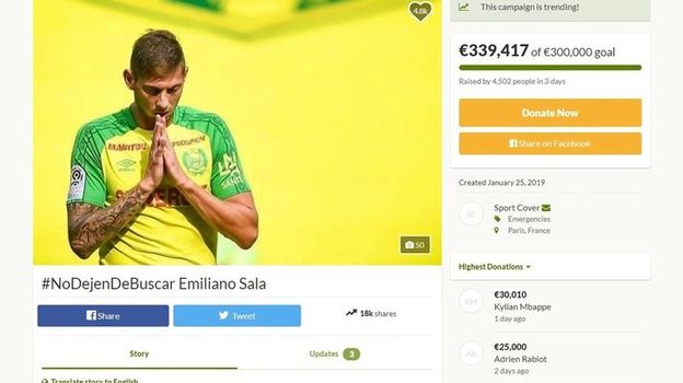 Но семью футболиста такое положение дел не устроило. Родственники начали сбор средств на возобновление поисков через краундфандинговую платформу GoFundMe. За три дня на поиски Салы и пилота Дэвида Ибботсона было внесено почти 350 тысяч евро, притом, что целью ставилось собрать 300 тысяч.