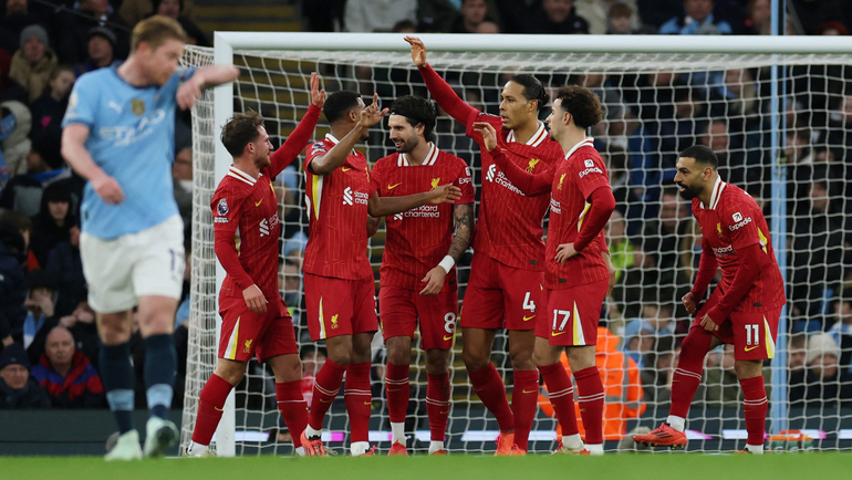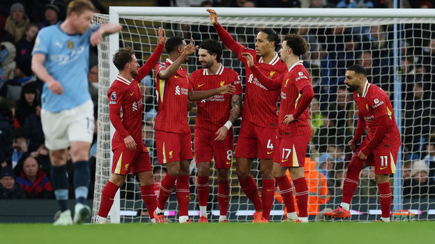 «Ливерпуль» также отвечал фланговыми выпадами имени Салаха и Луиса Диаса, которые старались раскачать своих оппонентов. Но одно дело создавать подходы, другое — качественно конвертировать их в голы. И в этом важнейшем компоненте гости были этим вечером куда лучше. На 12-й минуте Макаллистер с углового прострелил в сторону Собослаи, тот скинул мяч Салаху, и египтянин открыл счет. Это его 14-й гол в ворота «Ман Сити», повторение рекорда Стивена Джеррарда.