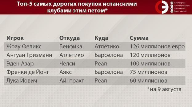 Еще неделю назад, 1 августа, Испания была впереди – 1,15 миллиарда евро против 1 миллиарда, потраченных англичанами. Трансферы Азара (100 миллионов) в "Реал", Гризманна (120 миллионов) и де Йонга (75 миллионов) в "Барселону" и Жоау Феликса (126 миллионов) в "Атлетико" стали настоящими бомбами. И это только самые крупные сделки