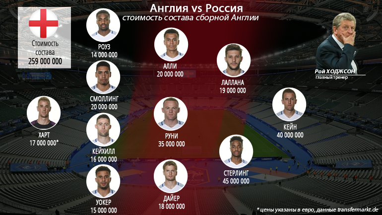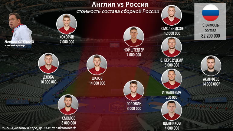 Перед первым матчем сборной России на чемпионате Европы-2016 с национальной командой Англии "СЭ" сравнил стоимость стартовых составов соперников.