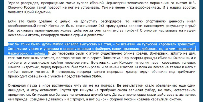 "Как бы то ни было, дубль Фабио Капелло выпускать не стал, - он все-таки не тульский "Арсенал" тренирует. Хоть мысли у всех и уползали в сторону эпизода с файером, наши принялись добывать то, за чем приехали в Черногорию, - победу", - так описано событие в отчете РФС.