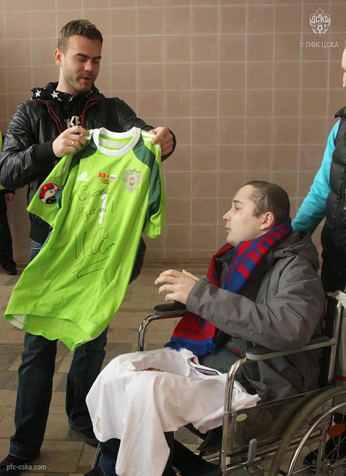 Вратарь ЦСКА и сборной России Игорь Акинфеев подарил болельщику армейцев – Сергею Зенкину – свою игровую футболку с матча с Черногорией. У молодого человека серьезное заболевание – опухоль мозга, сообщает официальный сайт ЦСКА. Также голкипер вручил поклоннику красно-синих майку с гербом ЦСКА. На стадионе "Октябрь" болельщик пообщался с Леонидом Слуцким, Сергеем Игнашевичем, Алексеем Березуцким, Зораном Тошичем и другими игроками команды.