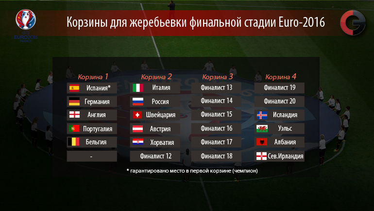 В четвертую корзину однозначно попадут Исландия, Уэльс, Албания и Северная Ирландия. Судьба Польши, Румынии, Словакии и Турции будет зависеть от итогов "стыков", которые повлияют на рейтинги команд.