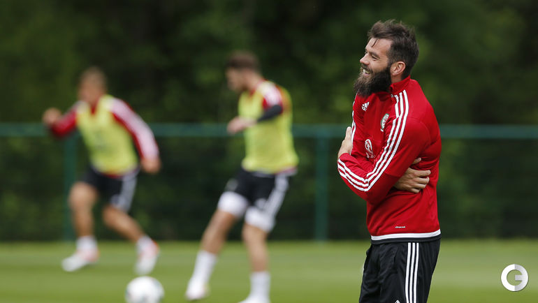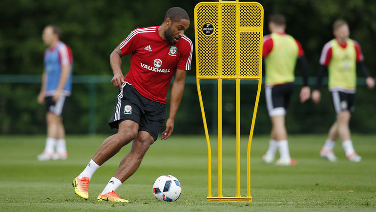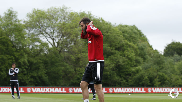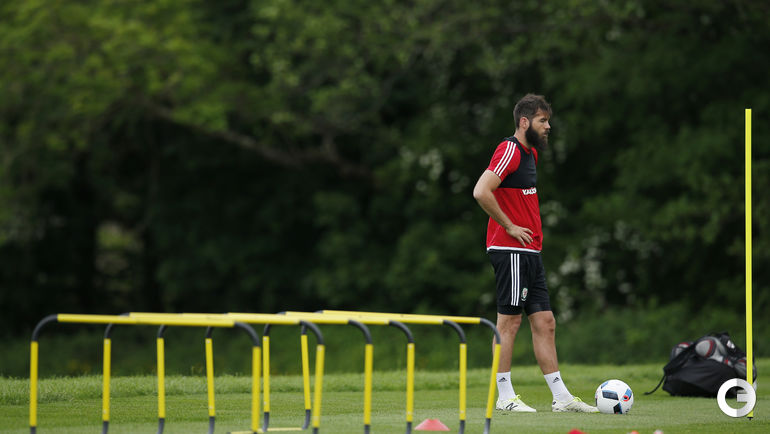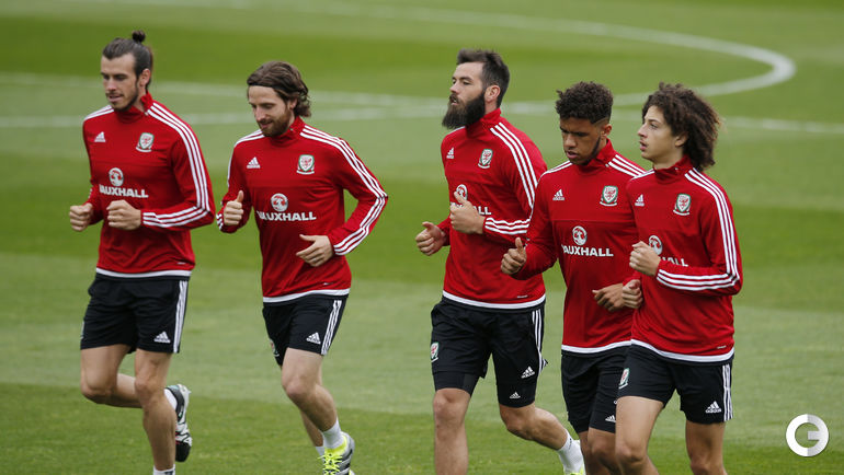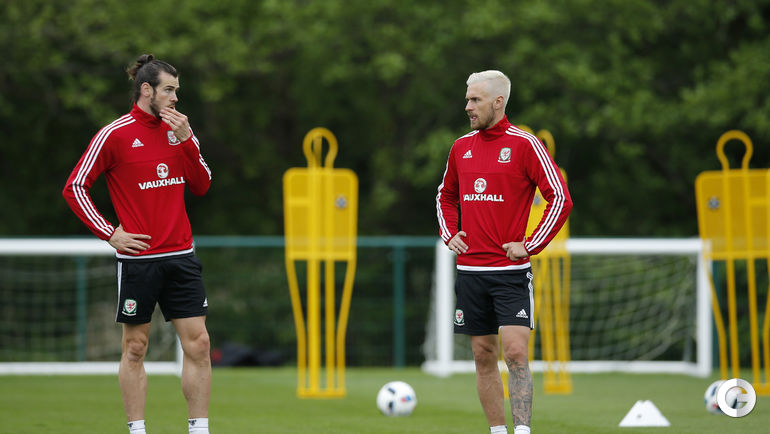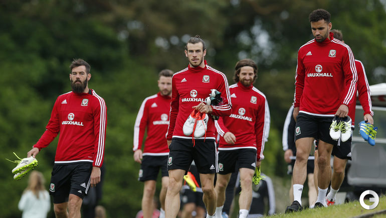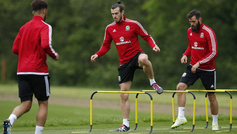 Гарет Бэйл, звезда сборной Уэльса, соперника российской команды на Euro-2016, и мадридского "Реала" на тренировке валлийской команды в графстве Гламорган.
