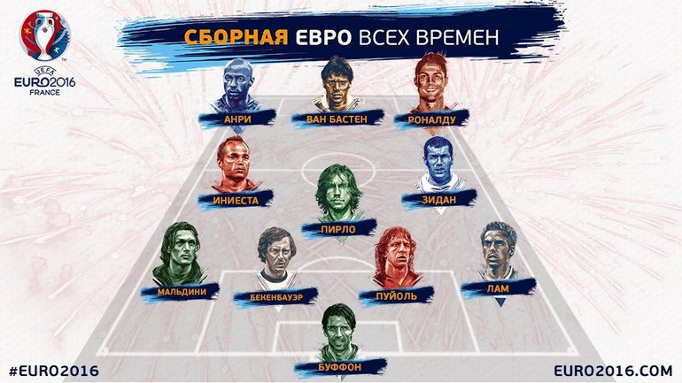 При этом символический состав Euro по версии российских болельщиков выглядит следующим образом: Лев Яшин - Серхио Рамос, Франц Беккенбауэр, Паоло Малдини - Руд Гуллит, Хави, Зинедин Зидан, Андрес Иньеста, Мишель Платини - Герд Мюллер, Марко ван Бастен.