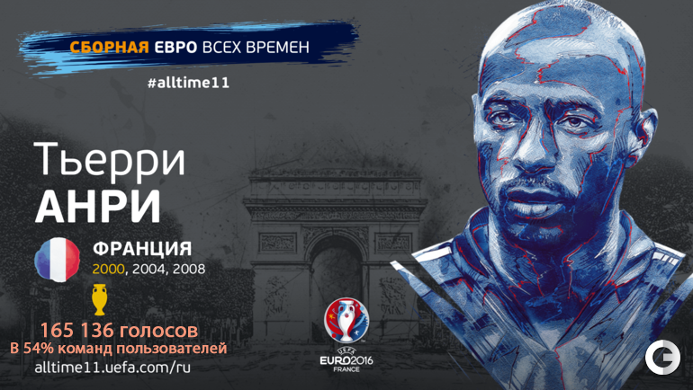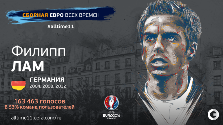 Полностью символический состав Euro по версии болельщиков выглядит следующим образом: Джанлуиджи Буффон - Филипп Лам, Карлес Пуйоль, Франц Беккенбауэр, Паоло Малдини - Зинедин Зидан, Андреа Пирло, Андрес Иньеста - Криштиану Роналду, Марко ван Бастен, Тьерри Анри.