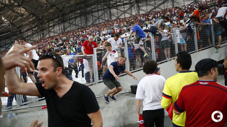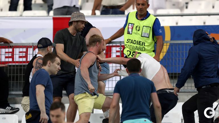 После финального свистка в матче группового турнира Euro-2016 Англия – Россия (1:1) на трибунах стадиона "Велодром" в Марселе началась драка. Российские фанаты массово ворвались в соседние сектора с английскими болельщиками и устроили драку. Отметим, что на той же боковой трибуне по ходу второго тайма российские фанаты жгли пиротехнику.