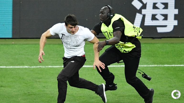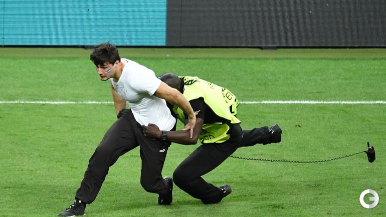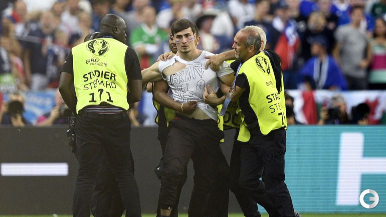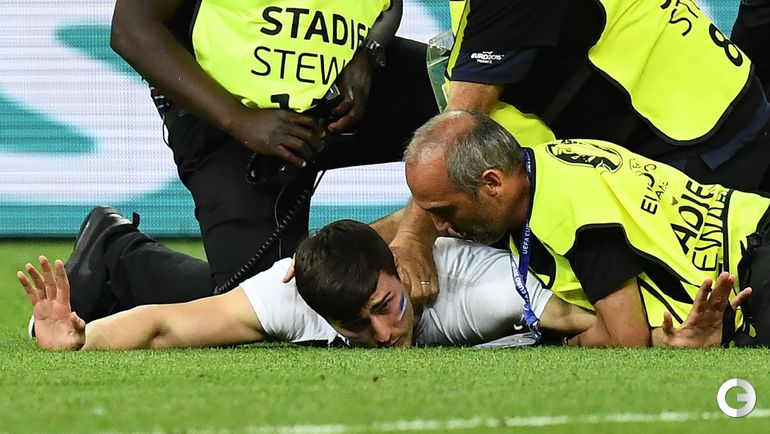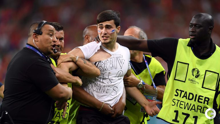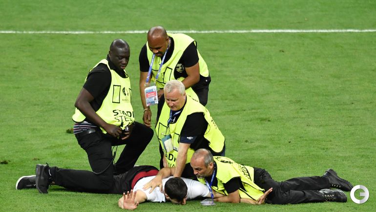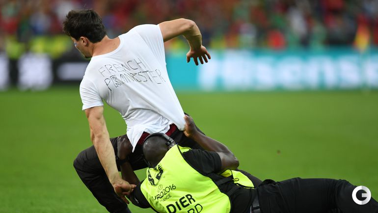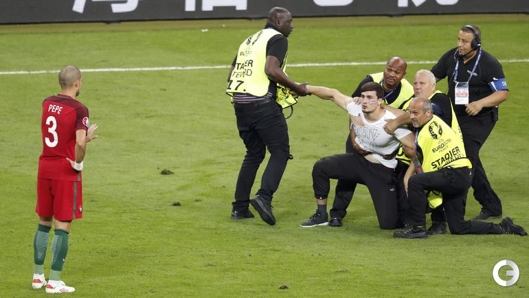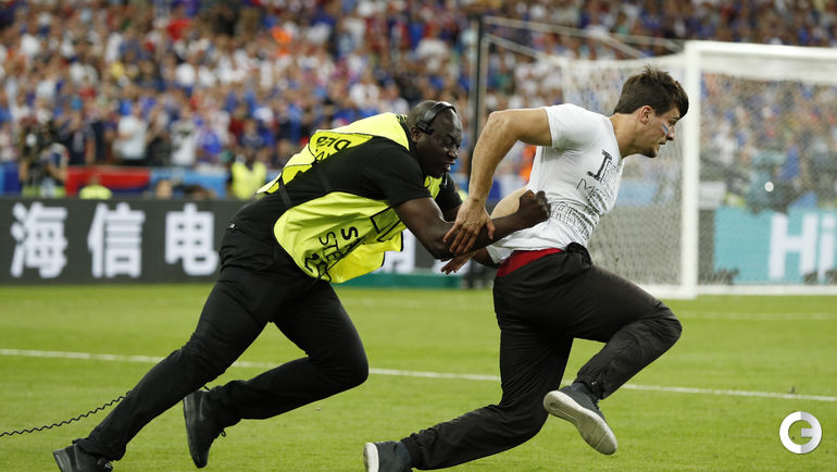 Во время финального матча чемпионата Европы-2016 между сборными Португалии и Франции стюардам пришлось ловить выбежавшего на поле французского фаната.