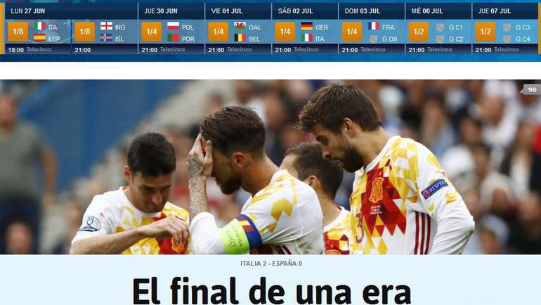 Испания лишилась своей короны. Ту, которую она носила восемь лет перед флагами всех европейских стран. И Испания потеряла корону при ленивой игре, которую лучше забыть. Уступив команде, которая была сокрушена Испанией на двух предыдущих чемпионатах Европы. Но на третий раз Италия разыграла свою вендетту. Игра сборной Испании была несогласованной, как два года назад на бразильском чемпионате мира. Не было стиля, отсутствовала уверенность, не хватало души. Недоставало идей и футбола. Победа Италии была неоспоримой. Поражение Испании казалось неизбежным на протяжении всей игры. Второе подряд фиаско разрушает славный цикл команды, которой руководит - пока еще - Висенте дель Боске.