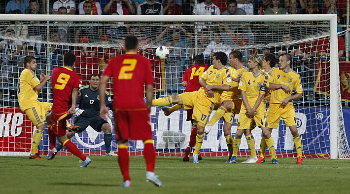 7 июня 2013 года. Подгорица. Черногория - Украина - 0:4. Мирко ВУЧИНИЧ (№9) исполняет штрафной.