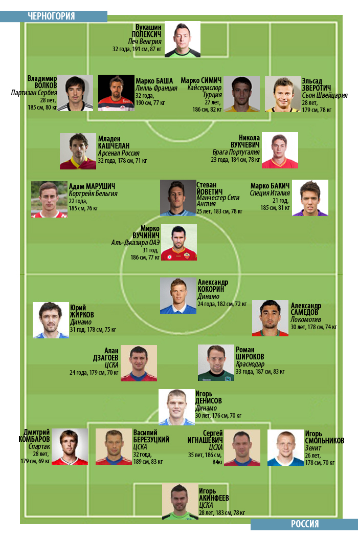 В составе черногорской команды сразу трое футболистов, играющих за российские клубы – Владимир Божович ("Мордовия"), Младен Божович ("Томь") и Младен Кашчелан ("Арсенал"). Также опыт выступления в России имеют Никола Дринчич, Марко Баша и Симон Вукчевич. |