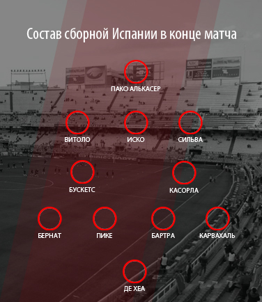 Стартовый состав испанцев был далек от оптимального. Дель Боске решил приберечь всех футболистов "Барселоны", выходивших на поле в финале Лиги чемпионов. Вне основного состава оказались Пике, Жорди Альба, Бускетс и Педро, которые наверняка начнут с первых минут следующий матч – в воскресенье против сборной Белоруссии в Борисове в рамках отборочного турнира к чемпионату Европы.