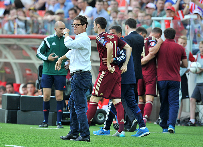 Когда у российских болельщиков во время исполнения гимна один из баннеров развернулся только наполовину, стало тревожно – как будто под полководцем перед битвой споткнулась лошадь. Но мысль, что в бой команду ведут не трибуны (они лишь помогают), а главный тренер, поначалу успокаивала. К тому же с Фабио Капелло никаких казусов перед игрой не произошло.